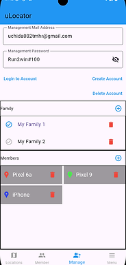First, determine the management account(mail address) and create management acount on this app.Then, you can register/edit/delete of family and register/edit/delete of menber.